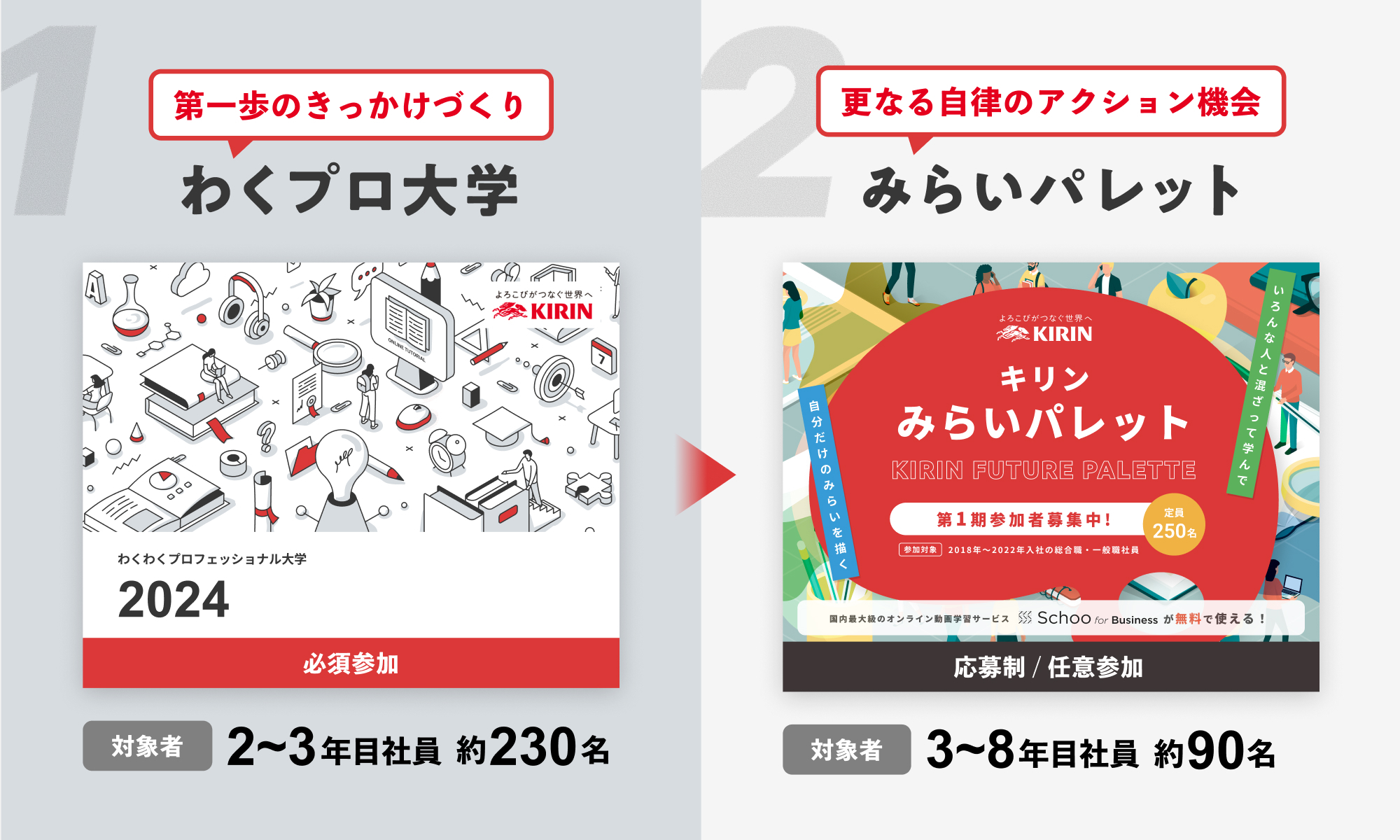 ・「キリンみらいパレット」では、3〜8年目の若手・中堅社員が公募で参加し、部署や年次を超えた交流を通じて視野を広げる