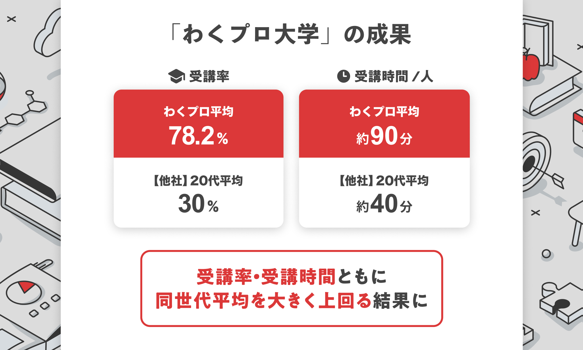吉村さん:「わくプロ大学」では、4カ月間を通して、受講率・受講時間ともに同世代平均を大きく上回る結果が出ています。受講率は他社20代平均が30%のところ、わくプロ平均は78.2%(毎月176名が視聴)、ひとり当たりの受講時間も他社20代平均が約40分のところ、わくプロ平均は約90分となっています。