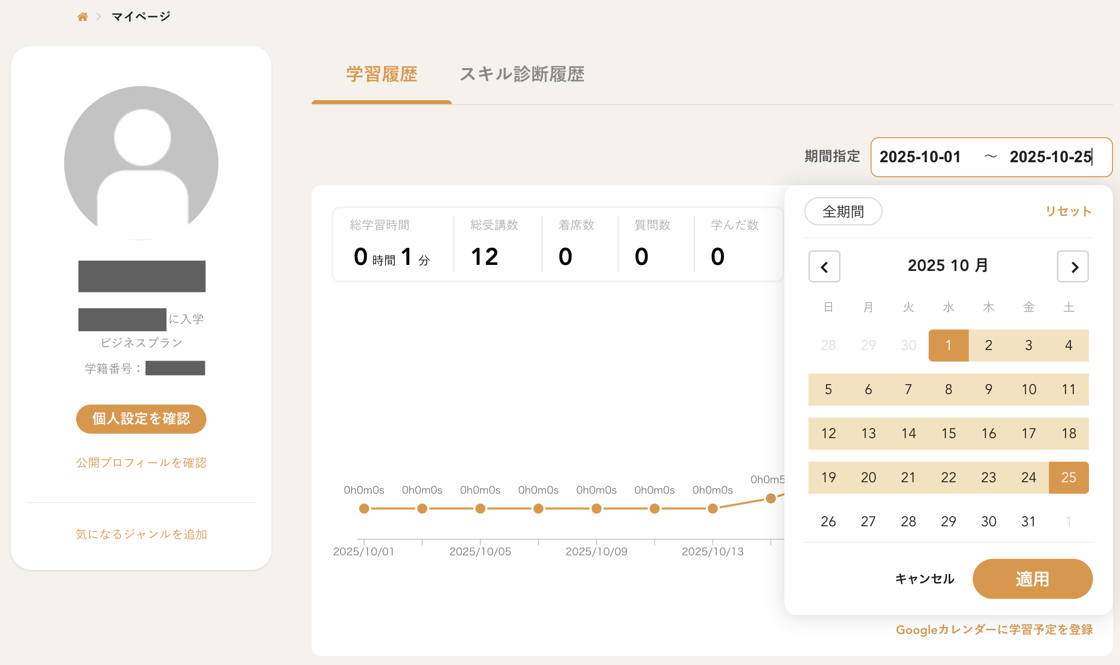 【機能アップデート】マイページにて、学習履歴が期間指定表示できるようになりました