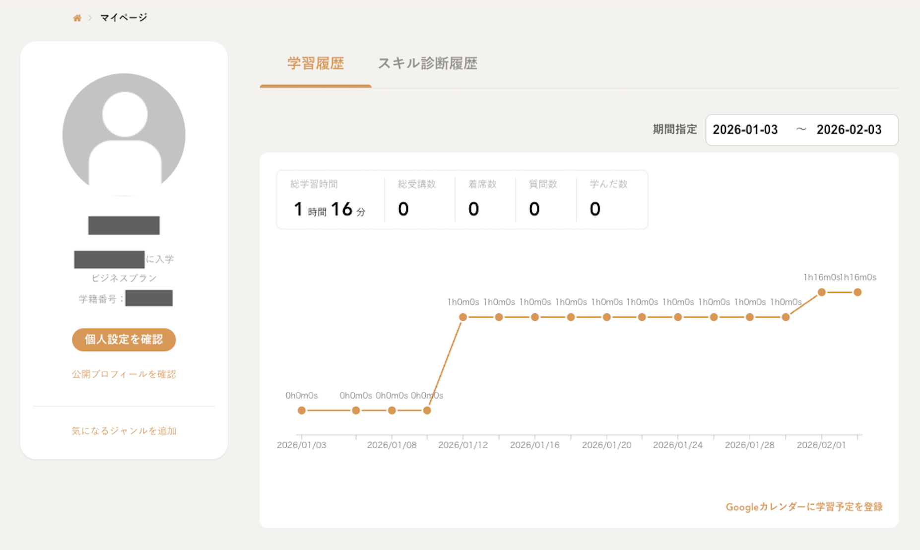 特定期間を指定することで、学びの現状を把握しやすくなります。