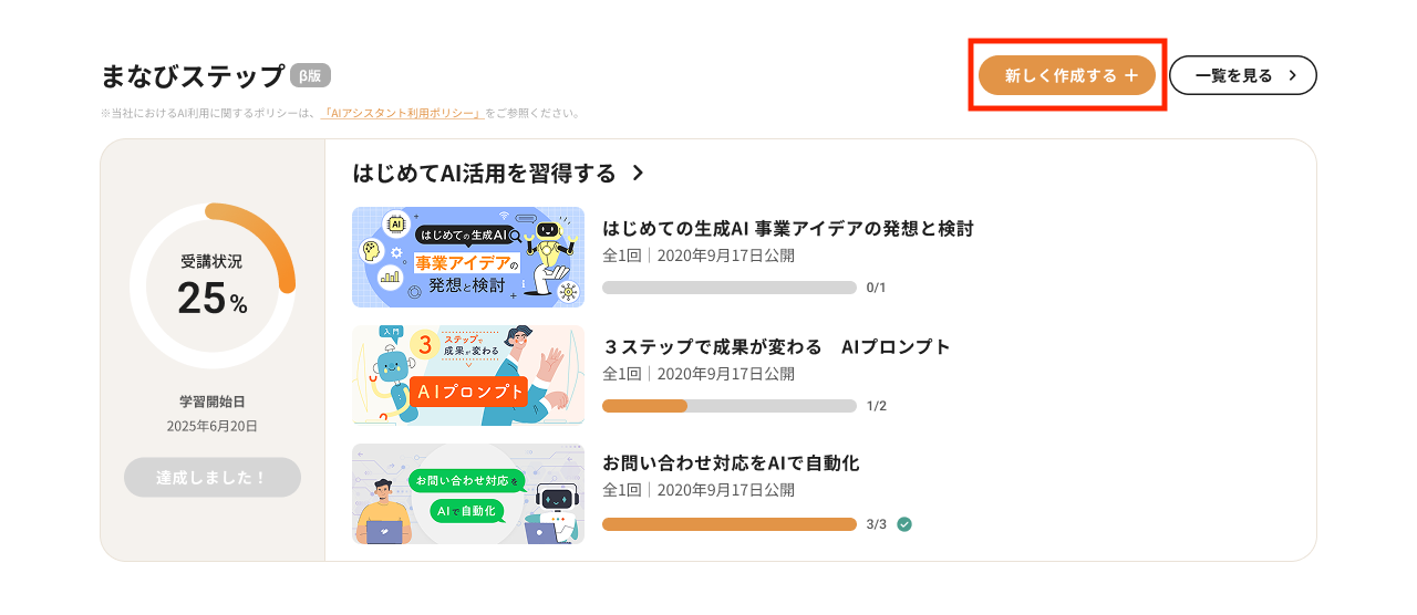 トップページの「まなびステップ」箇所にて「新しく作成する」を押下してください