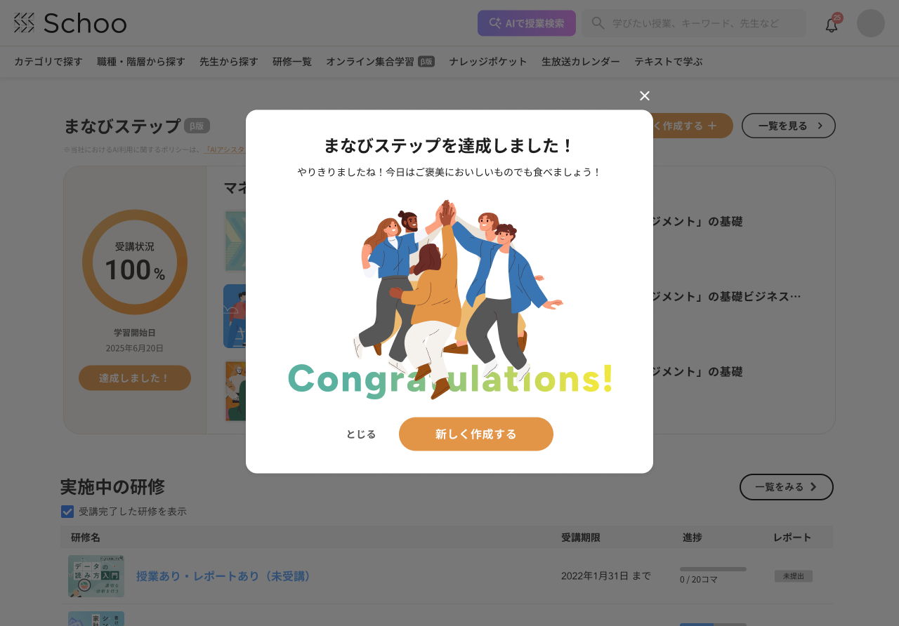「まなびステップ」の全授業が受講済となった場合、「達成しました!」ボタンを押下することで「まなびステップ」が達成となります。