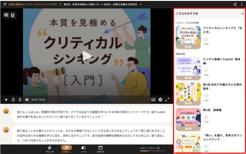 アーカイブ(録画)授業の受講画面の右側に開閉可能なおすすめ授業パネルを設置します。